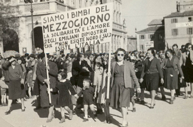Nell’immediato dopoguerra, per anni, migliaia di famiglie di lavoratori del centro-nord, per lo più emiliane e romagnole e toscane, aprirono le proprie case a bambini provenienti dalle zone del Paese più povere e più colpite dalla guerra. Da Cassino bombardata, da Napoli semidistrutta, da Roma baraccata, poi dalle campagne affamate della Puglia e della Sicilia. Essi trovarono nelle nuove città cose mai viste: l’acqua corrente nelle case, le lenzuola profumate nel letto, la carne sulla tavola. Furono curati e vaccinati. Impararono a leggere e a scrivere.
