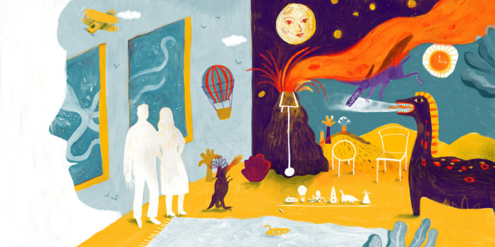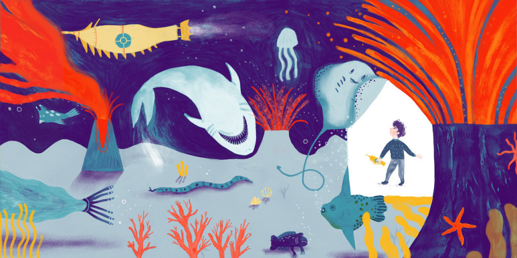 Giulia Conoscenti, classe 91, illustratrice e animatrice, è nata e ha studiato disegno industriale a Palermo; a 21 anni lascia la Sicilia per frequentare Illustrazione presso l’ISIA di Urbino, dove si laurea nel 2017. Nello stesso anno vince il Premio Ronzinante, un contest annuale di illustrazione che incoraggia giovani illustratori e illustratrici a misurarsi con il tema della disabilità: Giulia realizza due tavole collegando l’autismo ai viaggi straordinari di Verne. Le sue illustrazioni, sempre ricche e particolareggiate, si collocano in un luogo sospeso tra il sogno e l’immaginazione, dove le figure si mescolano al paesaggio e il limite tra esterno e interno non è mai netto, ma lascia sempre una sensazione di incertezza e mistero che destabilizza chiunque l’osservi. Sono opere sono fortemente materiche, frutto di una sperimentazione continua e di una mescolanza di tecniche, dalle chine ai pennarelli, passando per gli acrilici. Il suo tratto è gestuale e la ricchezza di particolari rende le tavole fortemente narrative; non a caso uno dei mezzi narrativi che predilige è l’animazione.