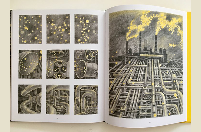 Un libro con il quale ha vinto il premio Cheltenham Illustration Award, pubblicato per la prima volta in Cina nel 2014 e successivamente in moltissimi altri Paesi. Si tratta di un silent book, un libro senza parole, che ha l’urbanizzazione e il suo impatto sulla natura e sulla vita come tema centrale. Racconta di un ragazzo che, in una grigia città metropolitana (in cui anche gli abitanti sembrano spegnersi insieme ad essa e la natura sembra scomparire senza lasciare tracce) trova una foglia che splende, bellissima, in mezzo a un mucchio di foglie secche. Inizierà così un’avventura per scoprire che cosa accade alla natura, dove vanno a finire tutte quelle foglie. Cento pagine di narrazione, con un linguaggio che non necessita di parole, ma che si avvale piuttosto della potenza evocativa e comunicativa di immagini quasi monocromatiche, in toni di grigio, dove l’eccezione della foglia, colorata di giallo (accanto ad alcuni dettagli della città in blu), risulta ancora più splendente e si fa carico non solo di rappresentare la forza della natura, ma anche di un messaggio di vita e di grande speranza, nel grigio che sembra avvolgerci sempre di più.