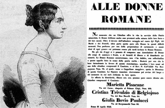 Nella Repubblica Romana spicca la figura di Cristina Trivulzio, viaggiatrice e conoscitrice di tutte le lingue europee, responsabile dell’assistenza medica nella Roma liberata. Proprio lei, con grande attenzione all’igiene e alla dignità umana, permette la resistenza della Repubblica. Da lei viene istituito un corpo femminile specializzato in assistenza infermieristica e su sue pressioni viene creato dal triumvirato un servizio ospedaliero ufficiale e organizzato; inoltre i tetti degli ospedali sono coperti da drappi neri perché siano riconoscibili e non toccati.