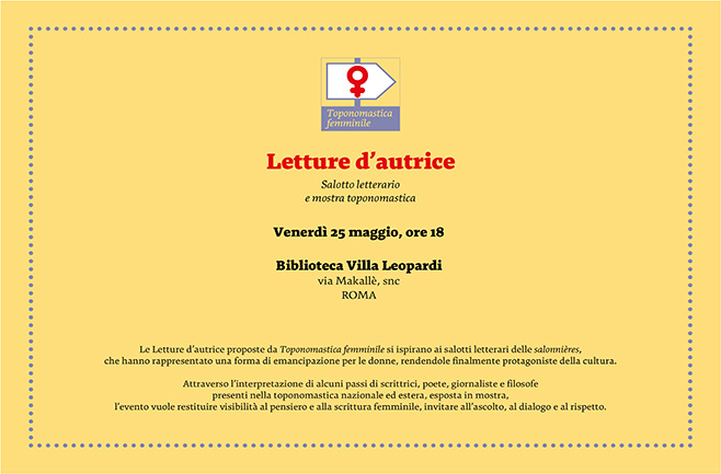 Quello che si terrà venerdì 25 maggio alle ore 18 nella sala al piano terra della Biblioteca comunale di Villa Leopardi a Roma è il 4° salotto letterario romano di Toponomastica femminile. Qui, al contrario del mondo greco, le protagoniste sono le donne: Toponomastica femminile vuole infatti accendere la luce, attraverso l’interpretazione di brani e di versi di scrittrici, poete, giornaliste, filosofe ricordate nella toponomastica italiana e straniera, su quanto l’immaginazione femminile ha saputo creare con le parole.