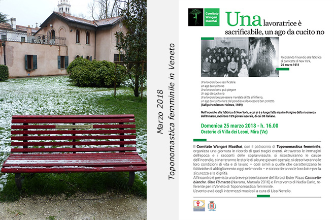 Passando dalle scienziate al lavoro, e in particolare alle lotte per la sicurezza sul lavoro, a Mira, in provincia di Venezia, il 25 marzo, siamo state presenti all’incontro organizzato dal Comitato Wangari Maathai, dove, partendo dalla presentazione del libro di Ester Rizzo Camicette bianche. Oltre l’8 marzoe dalle cause che diedero origine alla commemorazione dell’8 marzo, attraverso la lettura delle testimonianze delle sopravissute e documentazione del tempo, sono state ricostruite le assenze e le carenze datoriali che portarono alle lotte, anche queste documentate, per avere maggiore sicurezza nei posti di lavoro. Nonostante ciò, a distanza di oltre un secolo, la situazione lavorativa delle donne è più precaria rispetto agli uomini e soggetta a discriminazioni e molestie sia morali che sessuali.