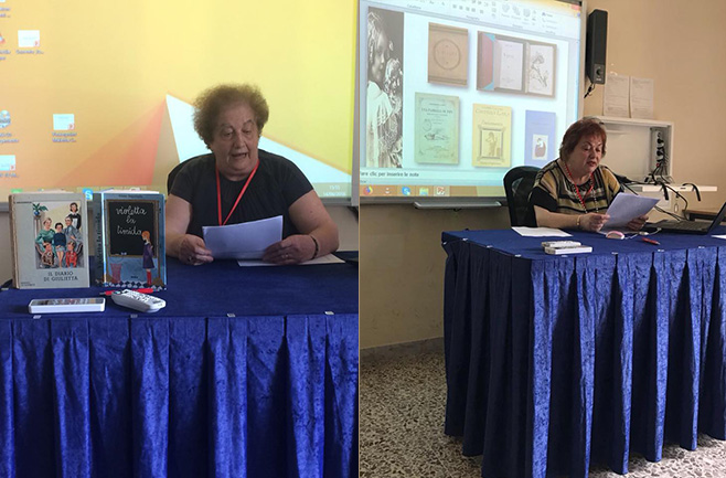 Di grande interesse per chi si interessi di studi sul femminile e la sua storia, nei diversi campi, si è distinto, organizzato dalla prof. Cosetta Seno, dell’Università del Colorado, un panel diviso su due sessioni (a destra nella foto sottostante), articolate nel primo dei quattro giorni di lavori, chair Angela Articoni, dell’Università di Foggia e Roberto Risso, dell’Università di Clemson, entrambi pure relatrice e relatore, dal titolo Modelli educativi nella letteratura per le bambine, con sei interventi: sulla contessa Lara (Angela Articoni), su Giana Anguissola (Anna Maria de Majo, associata Tf, dell’Università di Roma, a sinistra nella foto sottostante), su Emma Perodi (Alba Coppola, associata Tf , dell’Università di Salerno), sulla marchesa Colombi (Silvia Palandri, di Toponomastica femminile, che, impossibilitata ad esser presente, ha tuttavia inviato il suo intervento, letto dalla prof. Seno), su ‘pensieri pedagogici’ ottocenteschi di varie autrici (Roberto Risso), sui plutarchi femminili nell’educazione delle ragazze (Loredana Magazzeni, dell’Università di Bologna).