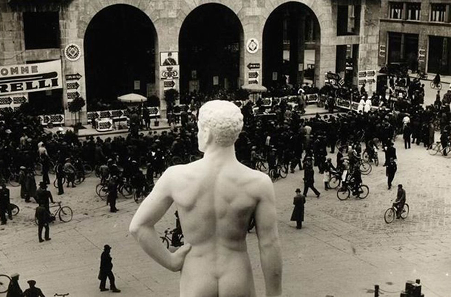Elemento costitutivo e caratterizzante dell’arredo urbano di Piazza della Vittoria, concepita nel progetto di Marcello Piacentini come “foro” dell’era fascista”, è l’installazione, circa a metà del lato ovest della piazza, di un’opera monumentale: una fontana esagonale, dal cui basamento emerge, straripante di vitalismo, un colosso alto circa sette metri scolpito dal carrarese Arturo Dazzi, che raffigura un aitante giovane nudo, leggermente proteso in avanti. La statua, ufficialmente intitolata “L’Era Fascista” e alternativamente “Alla giovinezza d’Italia”, ma popolarmente nota come il “Bigio”, diminutivo dialettale di Luigi, non è unanimemente apprezzata dalla cittadinanza, tanto che il Caffè Impero, cui la scultura dà le terga, è per questo motivo ribattezzato Bar de le ciàpe, mentre il vescovo proibisce al clero di passare davanti all’oscena nudità dell’opera. Piazza della Vittoria “interpreta […] il nuovo ordine fascista” ed esprime “fisicamente la pervasività dello Stato fascista”; viene usata soprattutto per manifestazioni del regime e le sue “adunate oceaniche”, ma, come il Bigio, non incontra il favore della cittadinanza e non riesce a diventare il “foro” dell’era fascista, il nuovo centro alternativo a tutte le altre piazze.