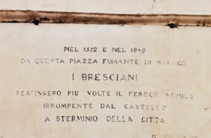 Proprio all’inizio della strada, all’angolo con via dei Musei, l’antico decumano massimo, si trovano alcune lapidi. Nella prima, collocata per decreto municipale nel 1918, si ricordano il “carnevale di sangue” di Gastone di Foix, nel 1512, e le Dieci Giornate del 1849, occasioni durante le quali le truppe francesi prima e quelle austriache poi, irrompono in città dal Castello, riuscendo a stroncare la resistenza della popolazione e facendone strage.