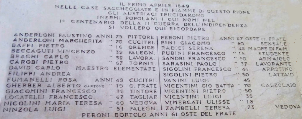 Nella seconda, collocata in occasione del primo centenario della seconda guerra di indipendenza, sono elencati i civili residenti nel rione trucidati dalle truppe asburgiche il 1° aprile 1849, alla fine delle Dieci Giornate, nel momento in cui la soldataglia, fiaccata la resistenza degli insorti, si dà al saccheggio e alla violenza.